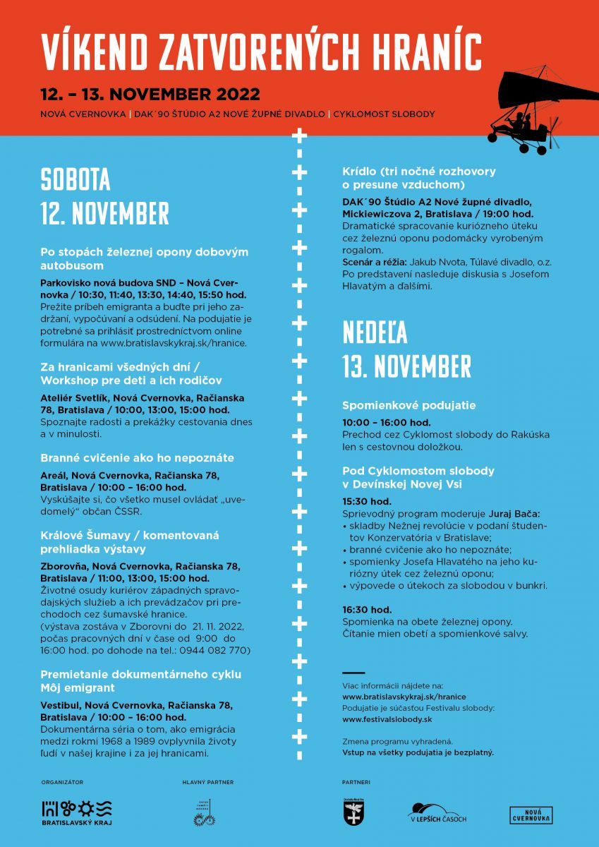 Program Víkendu zatvorených hraníc je naozaj pestrý a uskutoční sa na viacerých miestach v Bratislave. Prehliadku železnej opony dobovým autobusom, branné cvičenie, workshop o železnej opone pre deti a ich rodičov, výstavu Králové Šumavy, projekciu dokumentárneho cyklu Môj emigrant a divadelné predstavenie môžete zažiť počas soboty 12. novembra.
