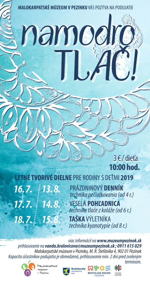Počas leta máme pre deti pripravené letné tvorivé dielne naMODROtlač!Počas troch dní v júli a troch dní v auguste sa deti oboznámia s typicky ľudovou kultúrou malokarpatského regiónu. Malokarpatský ornament v modrej farbe bude hlavnou súčasťou letných tvorivých dielní. Rôznymi technikami si vytvoria vlastné hand-made výrobky (denník s textilným prebalom, plátenná taška, pohľadnica) a prepoja tak históriu so súčasnosťou.
