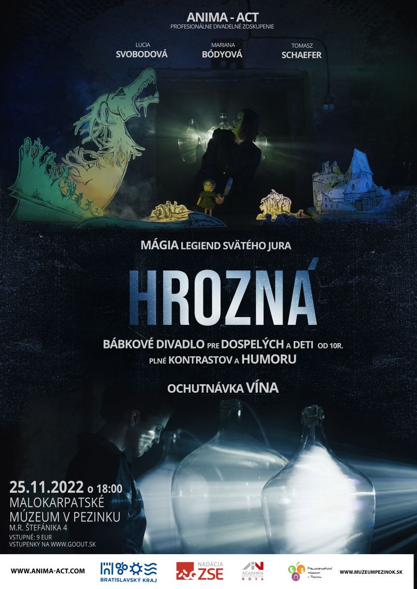 Občianske združenie Anima-Act inšpirovala kniha "Šúrsky drak a iné zlovesti" od autorky Violy Almássyovej k vytvoreniu bábkovej inscenácie "Hrozná". Témou je rodina a odpustenie, ktorá sa zrkadlí v príbehu dvoch sestier, ktoré na kare svojho otca odhaľujú tajomstvá Svätého Jura a tiež ich vinohradníckeho rodu. Príďte s nami zažiť ich cestu k "dorobeniu" toho najlepšieho vína.