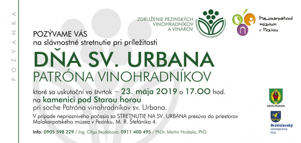 Pozývame Vás na na slávnostné stretnutie pri príležitosti dňa Sv. Urbana, patróna vinohradníkov. Stretnutie sa bude konať 23. mája o 17:00 na kamenici pod Starou horou, pri soche Sv. Urbana.V prípade nepriaznivého počasia sa stretnutie presunie do nášho múzea.