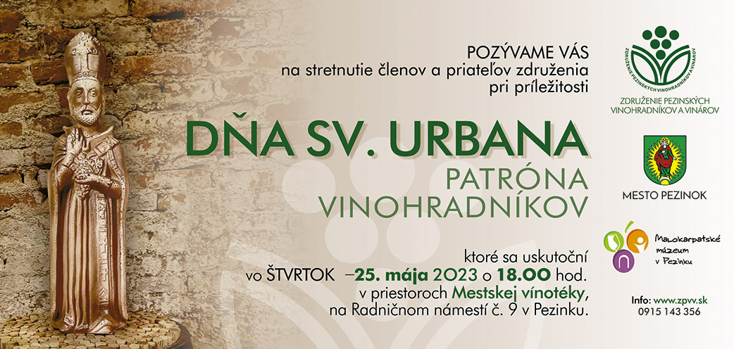 Pri príležitosti Dňa Svätého Urbana, patróna vinohradníkov a vinárov,vás pozývame 25. mája o 18:00 do Mestskej vinotéky. Požehnáme Svätého Urbana, aby chránil tohtoročnú úrodu a zhodnotíme prebiehajúci ročník.