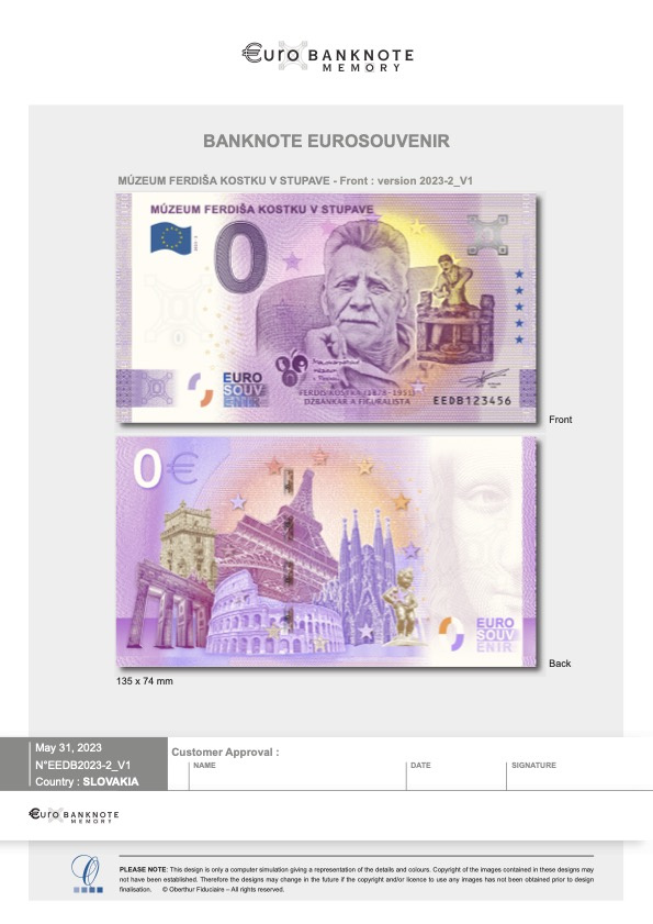 Múzeum Ferdiša Kostku v Stupave, ktoré spravuje Malokarpatské múzeum v Pezinku, vydáva v roku 2023 0 Euro Souvenir venovaný umelcovi Ferdišovi Kostkovi. Práve Ferdišovi Kostkovi bol v roku 1946 ako prvému výtvarníkovi na Slovensku udelený titul národného umelca. Bol významným a zručným džbánkarom, no uznanie a slávu získal vďaka svojim jedinečným figurálnym plastikám. Jeho tvorba je známa využívaním námetov zo stupavského folklóru, habánskej keramiky a známa je aj modernými figurálnymi motívmi. Inšpiroval sa životom a zvykmi obyvateľov Záhoria, remeselníkmi, džbánkarmi, vinohradníkmi a muzikantmi, ktorých zahrnul do svojej tvorby.