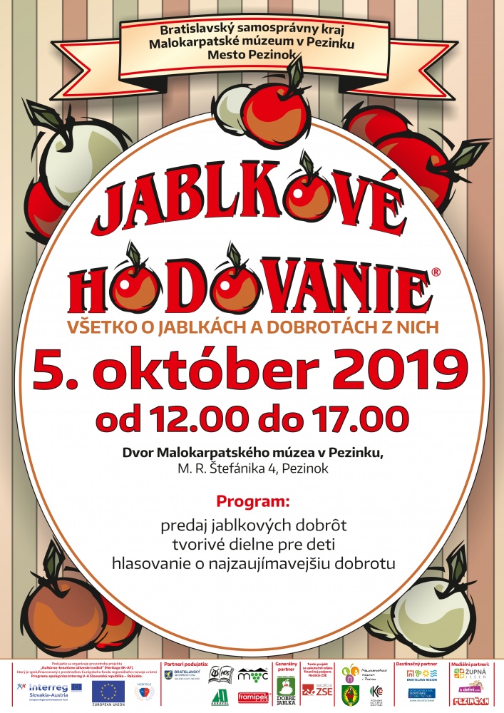 Nádvorie Malokarpatského múzea v Pezinku sa opäť zaplní stánkami plnými rôznych pochúťok, ktoré majú spoločného menovateľa - jablká. Srdečne Vás pozývame na ďalší ročník Jablkového hodovania, ktoré môžete navštíviť v sobotu 5.10.2019 v čase od 12:00 hod. do 17:00 hod. Vezmite so sebou celú rodinu, pre najmenších návštevníkov sme opäť pripravili tvorivé dielne. Vstup je voľný.
