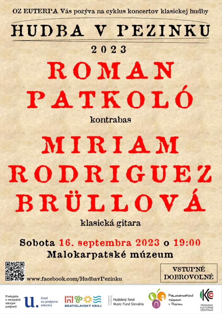 V sobotu 16.9.2023 o 19.00 hodine sa Malokarpatské múzeum v Pezinku stalo priestorom pre koncert zo série koncertov klasickej hudby Hudba v Pezinku 2023.Publiku sa predstavili kontrabasista Roman Patkoló a Miriam Rodriguez Brűllová hrou na klasickej gitare.