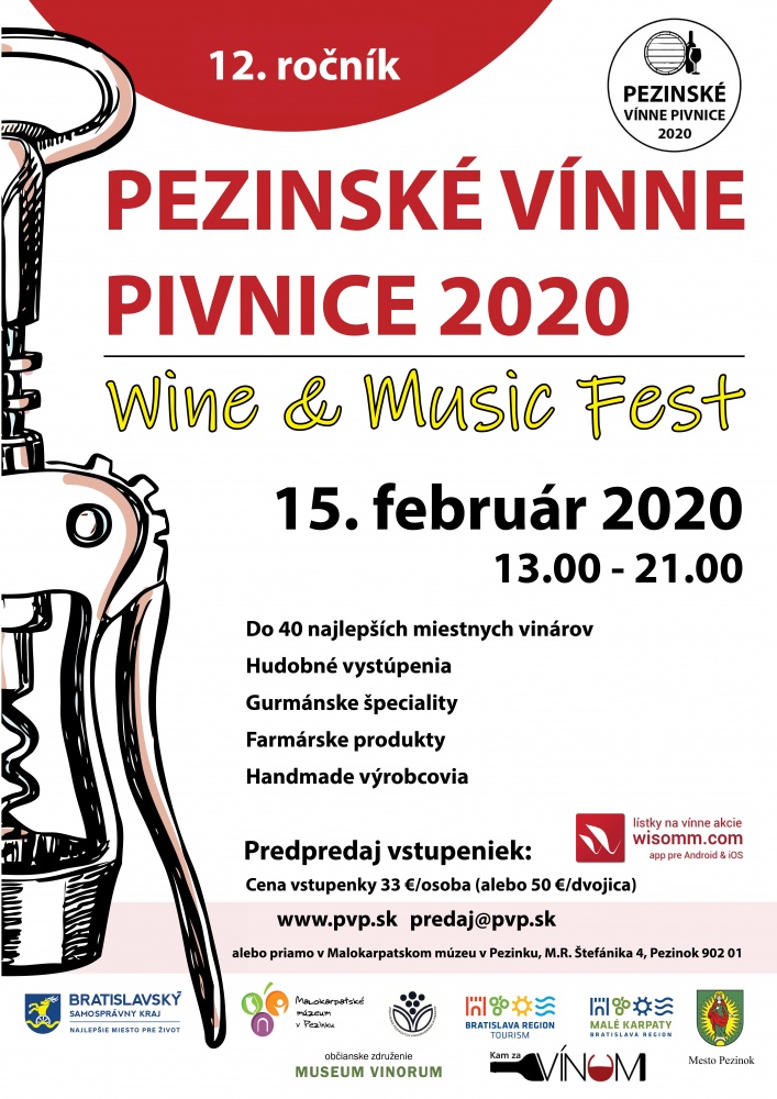 Milí priatelia dobrého pezinského vína,po roku Vám s radosťou oznamujeme, že 12. ročník podujatia Pezinské vínne pivnice 2020 sa uskutoční v sobotu, 15. februára 2020 v čase od 13.h. do 21.00 h. Členovia združenia pezinských vinohradníkov a vinárov ako aj hostia z najbližšieho okolia ponúknu to najlepšie, čo ukrývajú ich pivnice. Bohatá ponuka, ktorú pripravujeme, bude doplnená aj o hudobný program. Príďte si spoločne vychutnať kvalitné domáce vínka, tradične, okolo sviatku sv. Valentína. Tento rok máme pripravený aj bohatý bezplatný hudobný program, ktorým rozširujeme kultúrnu ponuku nášho podujatia.