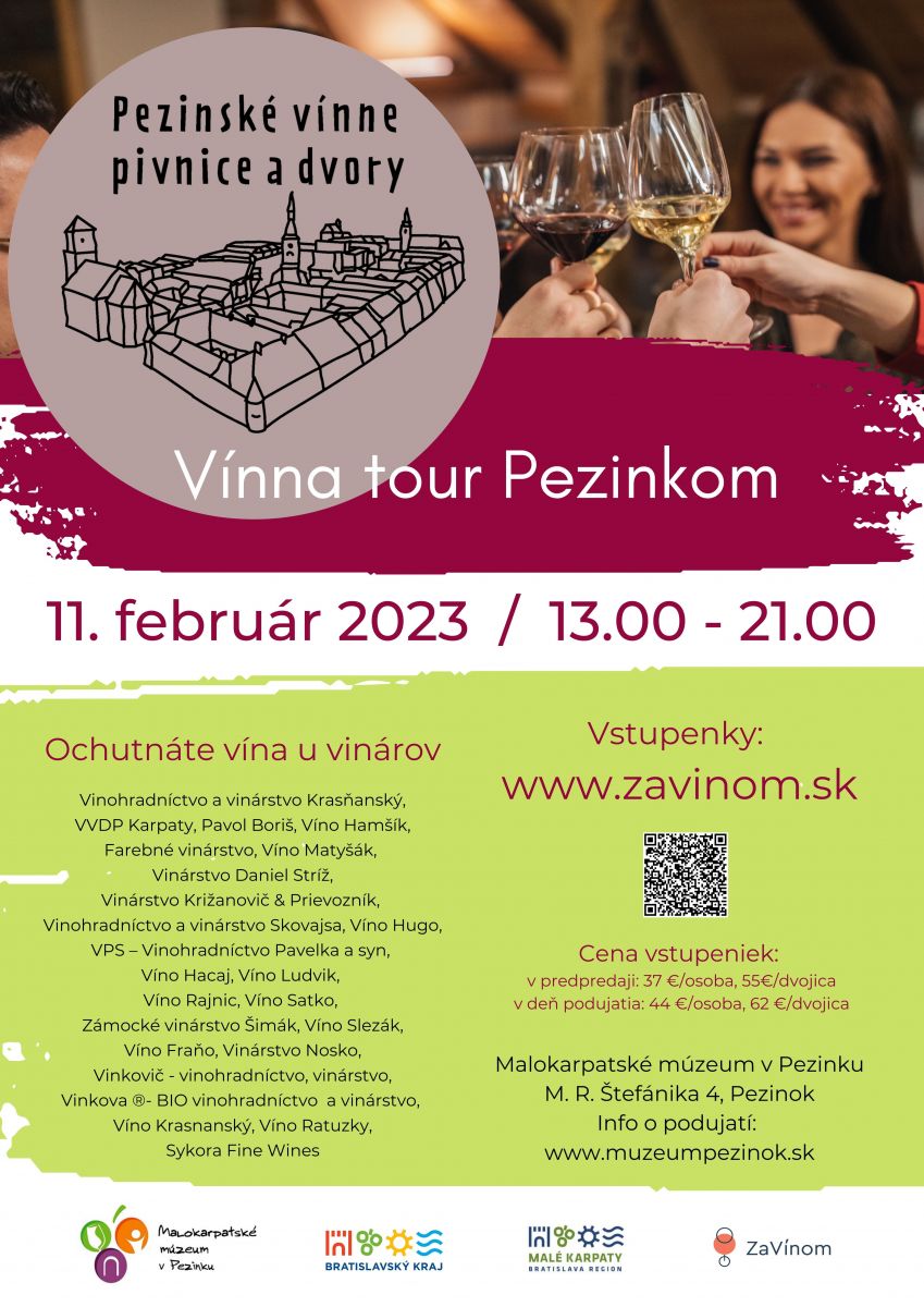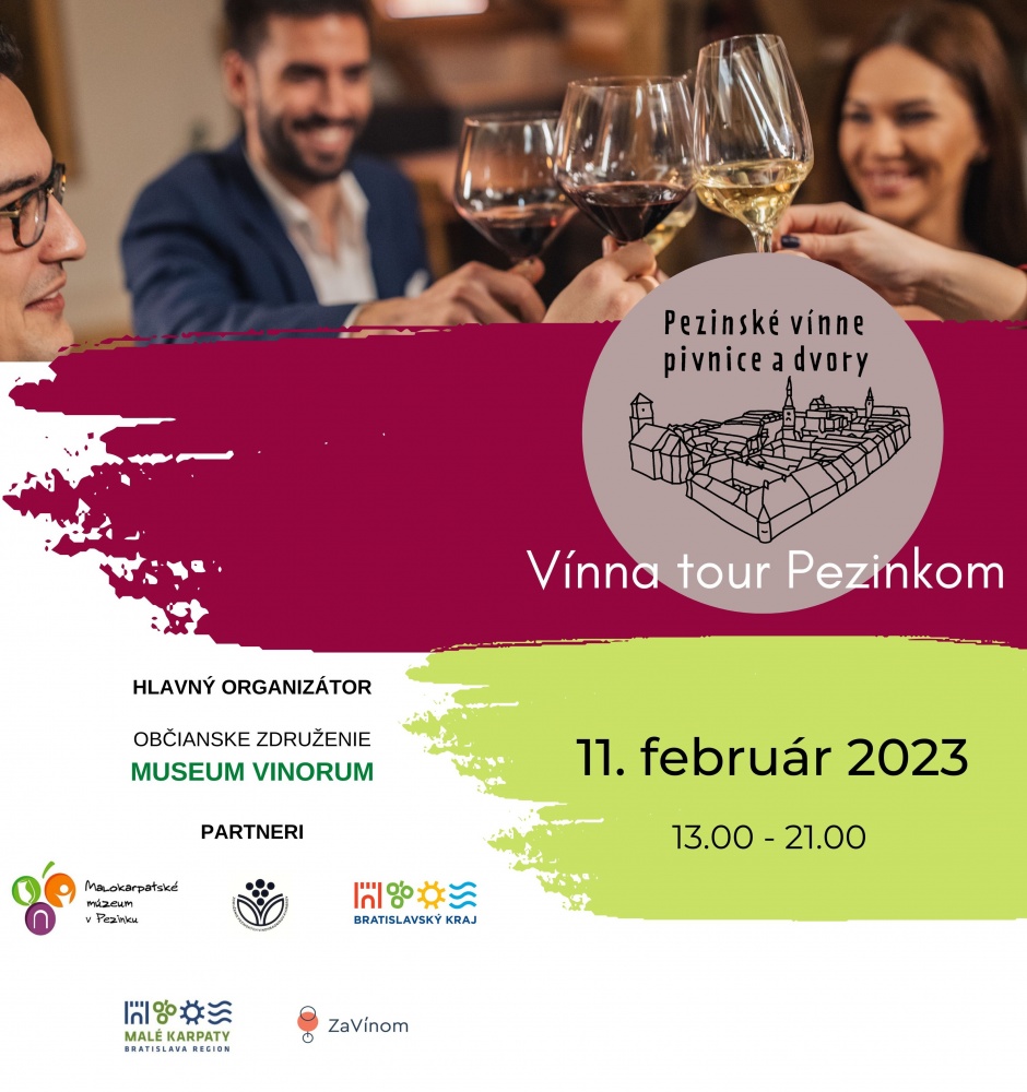 Pozývame vás na 15. ročník podujatia Pezinské vínne pivnice a dvory 2023 – Vínna tour Pezinkom, ktoré sa bude konať 11. februára 2023 v čase od 13.00 do 21.00 hod.V širšom centre mesta Pezinok na jednotlivých zastávkach členovia Združenia pezinských vinohradníkov a vinárov ponúknu to najlepšie, čo ukrývajú ich pivnice a dvory. Spojte putovanie za výborným vínkom s prehliadkou mesta a jeho historických zákutí!