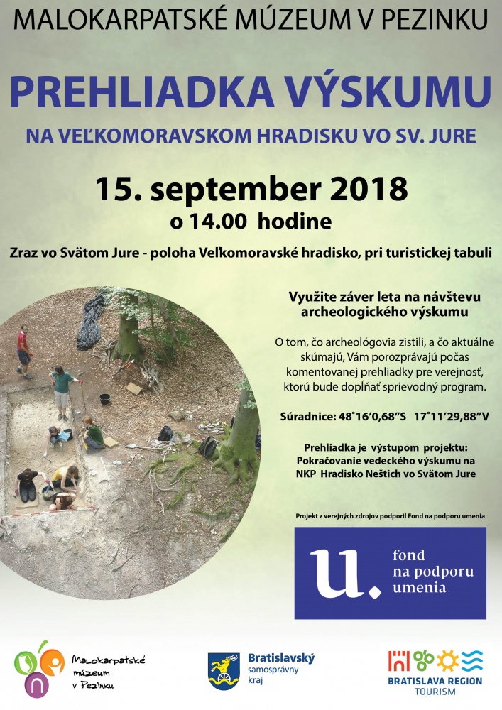 Pokračovanie vedeckého výskumu na NKP Hradisko Neštich vo Svätom Jure - výskumný projektMalokarpatské múzeum v Pezinku realizuje aj v roku 2018 archeologický výskum vo Svätom Jure, v priestore slovanskej pevnosti, jednej z najvýznamnejších na Slovensku. Na nálezisku je zaznamenané osídlenie rôznej intenzity už od doby halštatskej, vrchol však dosiahlo práve počas prítomnosti Slovanov. Počiatky slovanského osídlenia polohy patria do 8. storočia, do čias Avarského kaganátu. V čase 9. storočia sa zmenila na mohutnú 8,5 ha veľkomoravskú pevnosť.