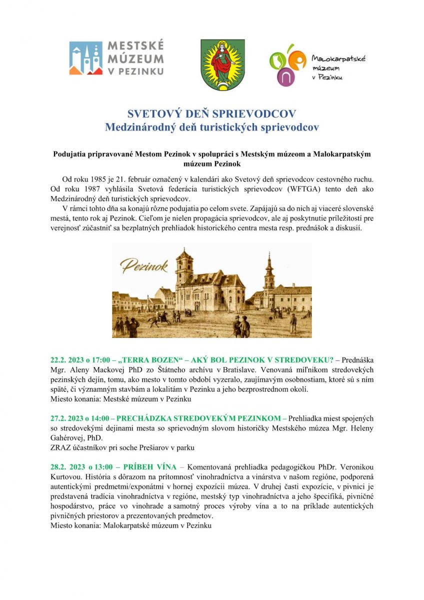 Od roku 1985 je 21. február označovaný ako Svetový deň sprievodcov cestovného ruchu. Pri tejto príležitosti v spolupráci s mestom Pezinok sme pripravili pre návštevníkov bezplatnú prehliadku múzea, ktorá sa bude konať 28. februára o 13:00.Horná expozíciía múzea sa venuje histórií s dôrazom na prítomnosť vinohradníctva a vinárstva v našom regióne, podporená autentickými predmetmi/exponátmi. V druhej časti expozície, v pivnici, je predstavená tradícia vinohradníctva v regióne, mestský typ vinohradníctva a jeho špecifiká, pivničné hospodárstvo, práce vo vinohrade a samotný proces výroby vína a to na príklade autentických pivničných priestorov a prezentovaných predmetov.