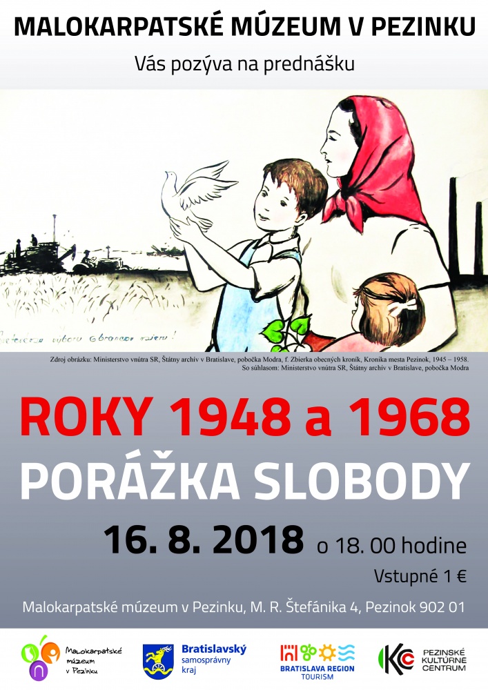 prijmite pozvanie na program pre verejnosť, na ktorom Vám historička Lucia Burdová Vám rada porozpráva o udalostiach spätých s februárovým prevratom 1948 a augustovými dňami roku 1968 v mestách malokarpatského regiónu. Už 16. augusta od 18.00 hod. Vám priblíži zlomové udalosti, ktoré stáli za oklieštením slobody. Čo mali roky 1948 a 1968 spoločné a v čom sa líšili? Ako reagovali ľudia na situáciu v ktorej sa ocitli v jednotlivých obdobiach? Ako dané udalosti zasiahli mesto Pezinok a ostatné mestá malokarpatskej oblasti? Aj na tieto otázky sa pokúsi odpovedať prednáška Roky 1948 a 1968 – Porážka slobody, ktorá sa zameria na situáciu v roku 1948 spojenú s nástupom totality, jej dopad na spoločnosť, hospodárstvo a v neposlednom rade pripomenie obete totalitného režimu.