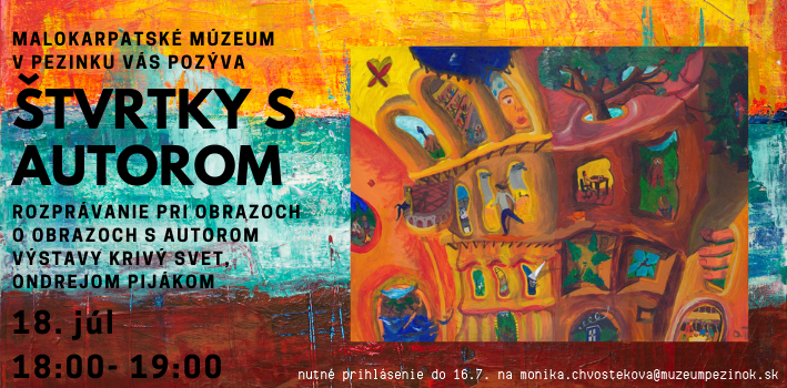 Dňa 18. júla od 18:00 do 19:00 sa uskutoční Rozprávanie pri obrazoch o obrazoch. Príďte a stretnite sa s autorom výstavy Krivý svet, Ondrejom Pijákom. Porozpráva Vám o svojej tvorbe, obrazoch či odpovie na Vaše otázky.Na udalosť je potrebné prihlásiť sa vopred a to do 16. júla na e-mailovú adresu monika.chvostekova@muzeumpezinok.sk.