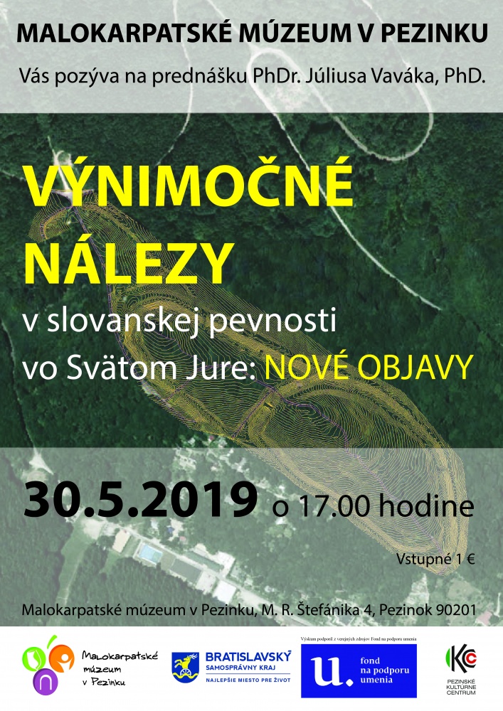 Dňa 30. mája o 17:00 sa uskutoční podujatie Výnimočné nálezy v slovanskej pevnosti vo Svätom Jure. Archeológ Július Vavák Vám porozpráva o včasnostredovekom opevnenom nálezisku nad Svätým Jurom, v spojení s najnovšími objavmi.Výskum podporil z verejných zdrojov Fond na podporu umenia.