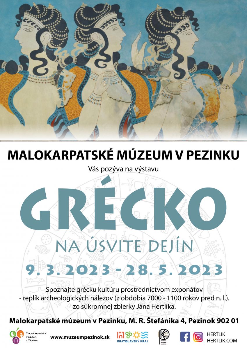 Pozývame vás na výstavu „Grécko na úsvite dejín“ autora Jána Hertlíka, ktorá sa uskutoční v Malokarpatskom múzeu v Pezinku od 9. marca do 28. mája 2023.Umenie klasického Grécka dlho zatieňovalo vyspelú kultúru, ktorá vznikla viac ako tisíc rokov pred vládou Perikla v egejskej oblasti. Na Kréte boli v tej dobe postavené výstavné paláce, zdobené nástennými maľbami, vznikali drahocenné šperky, pútavé sošky, keramika všetkého druhu. Keď sopečná katastrofa zničila minojskú civilizáciu, získali vedúcu úlohu Mykény, ktorej kultúra bola nemenej vyspelá a bohatá.