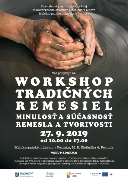 Bratislavský samosprávny kraj, Malokarpatské múzeum v Pezinku a Malokarpatské osvetové stredisko v Modre vás pozývajú na workshop tradičných remesiel – Minulosť a súčastnosť remesla a tvorivosti. Workshop sa uskutoční 27. septembra 2019 od 10.00 do 17.00 v priestoroch Malokarpatského múzea v Pezinku, M. R. Štefánika 4, Pezinok. Počas workshopu si budete môcť vypočuť zaujímavé prednášky a ukážky tradičných remesiel malokarpatského regiónu. Vstup je voľný.Podujatie je organizované v rámci projektu „Kultúrno-kreatívne oživenie tradícií (Heritage SK-AT), ktorý je spolufinancovaný z prostriedkov Európskeho fondu regionálneho rozvoja v rámci Programu spolupráce Interreg V-A Slovenská republika – Rakúsko.